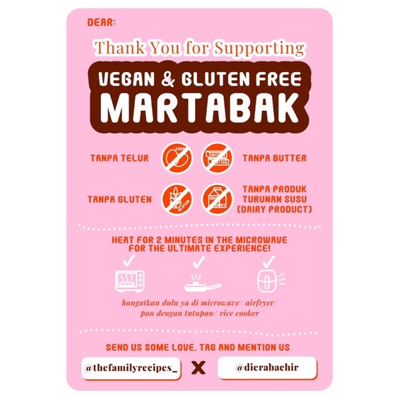 Produk Vegan & Gluten-Free Martabak harganya Rp. 115.000,00. Hingga saat ini sudah dimiliki oleh 95 orang. Mendapat Rating 4,86 dari 35. Sisa stok tersisa 905 lagi.
