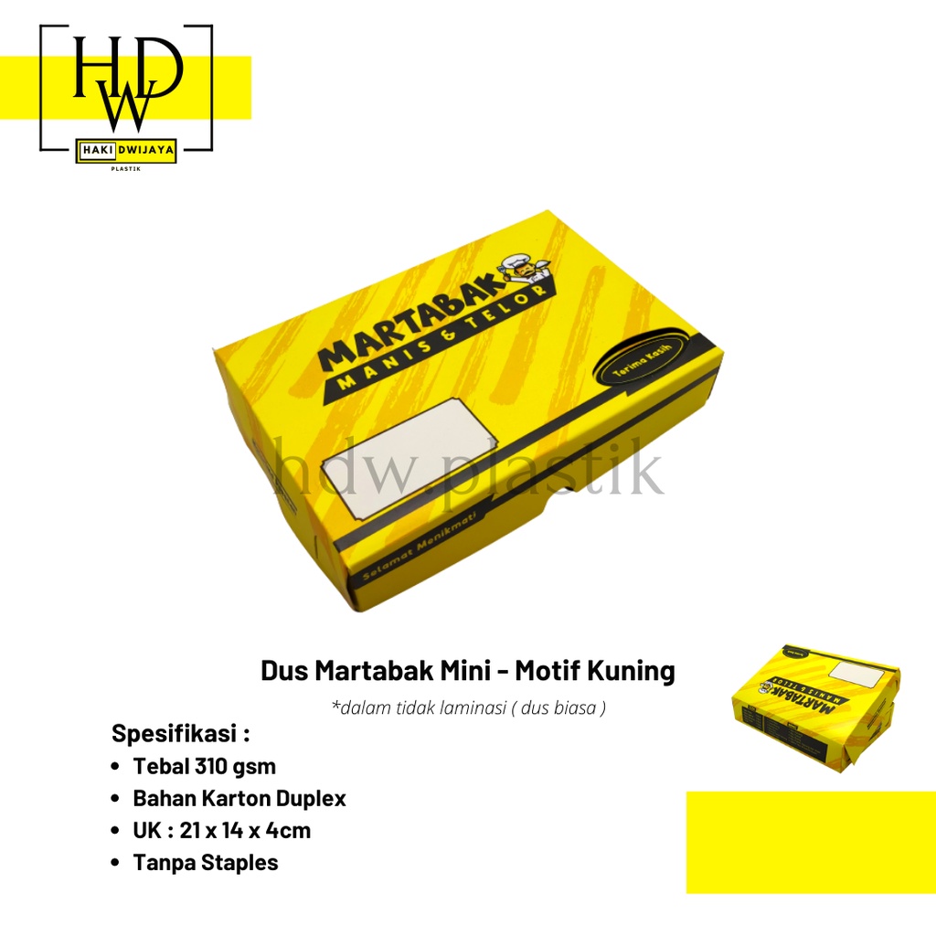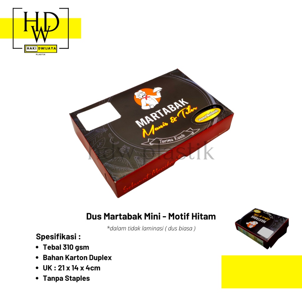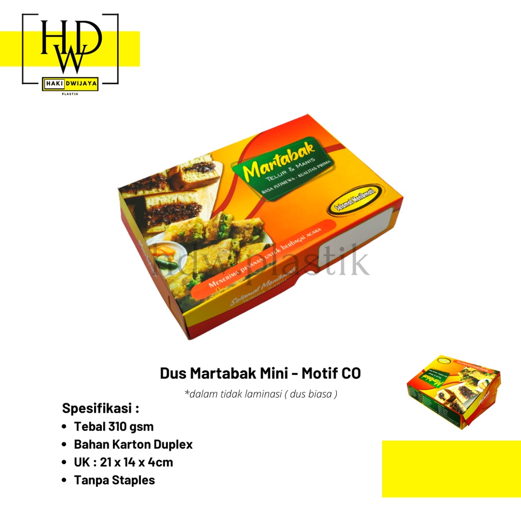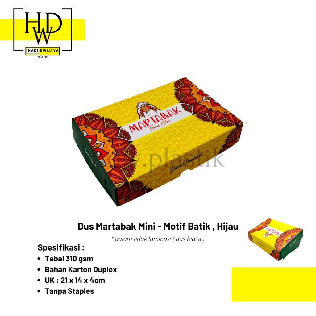 Produk [MIN 20Pcs] Box / Dus Martabak Mini 21x14x4cm Full Colour harganya Rp. 1.100,00. Hingga saat ini sudah dimiliki oleh 922 orang. Mendapat Rating 5 dari 5. Sisa stok tersisa 64303 lagi.